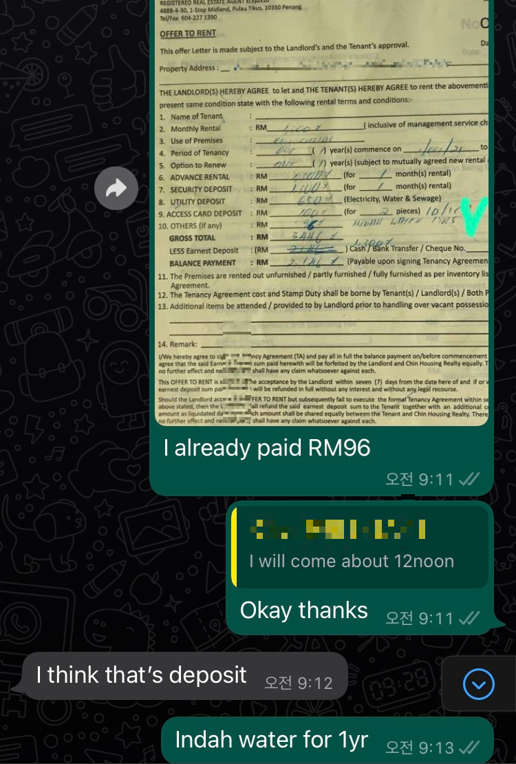KL에서는 에이전트 비용(Agent fee)은 100% 집주인 부담이라고 들었는데, 페낭에서는 한 달 치 월세 금액에서 집주인, 세입자 반반씩 부담을 한다. 그래서 에이전트 비용을 더 높게 받으려고 그러는지 모르겠지만 에이전트가 nego를 할 때 도움을 안주는 경우가 대부분이다.